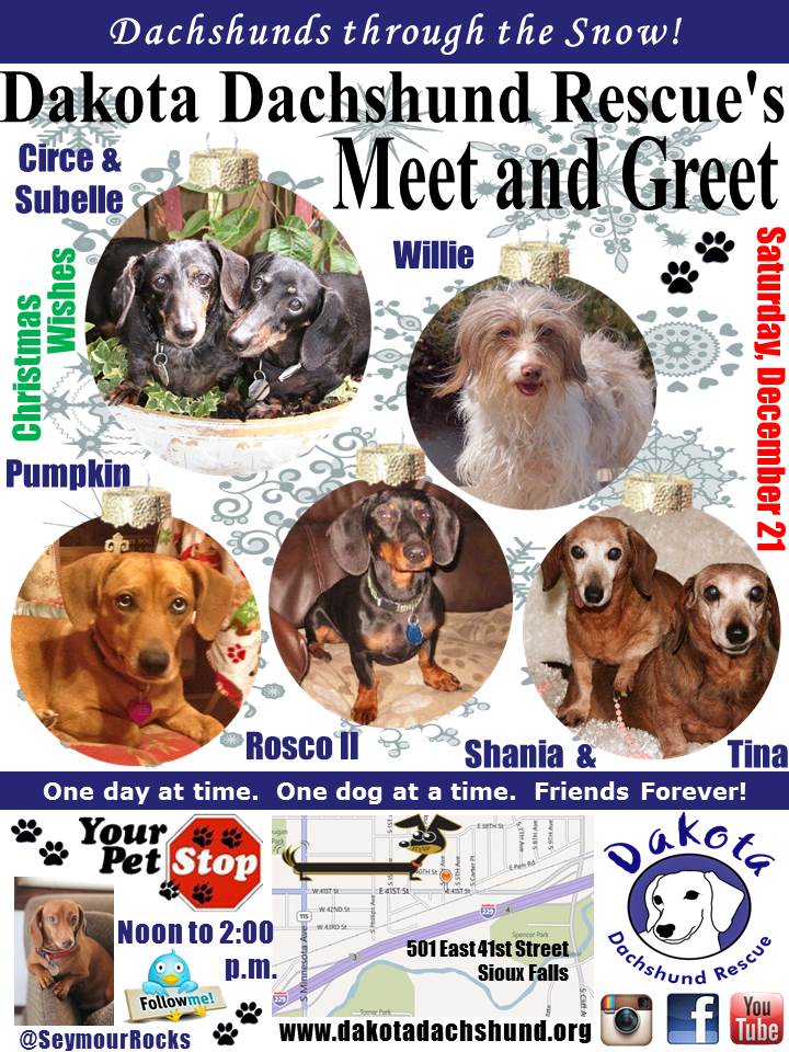 See our events calendar here. Current Scheduled Events: Monthly Meet & Greet Saturday December 21st, 2013 12:00 PM until 02:00 PM Location: Your Pet Stop (605) 221-2738 Map: 501 East 41st Street Sioux Falls SD 57105 See all of the animals attending this event. Come to Your Pet Stop East on Saturday, December 21st, from Noon to 2:00 p.m. in Sioux Falls and meet some of our wonderful adoptable dachshunds. Our dachshunds would be honored and truly blessed to find a home around your tree this Christmas. After all, that is what every dachsie dreams of . . . finding a forever home where they will be loved and a treasured member of the family. They cross their paws each night and say their dachsie prayers in hopes that their person will find them here in rescue. Our foster families assure them they will, but we all know what they really need. They don’t need Santa Paws. They need YOU!