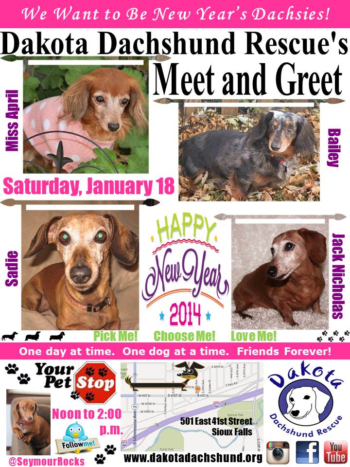 See our events calendar here. Current Scheduled Events: Monthly Meet and Greet Saturday January 18th, 2014 12:00 PM until 02:00 PM Location: Your Pet Stop (605) 221-2738 Map: 501 East 41st Street Sioux Falls SD 57105 See all of the animals attending this event. Come to Your Pet Stop East on Saturday, January 18th, from Noon to 2:00 p.m. in Sioux Falls and meet some of our wonderful adoptable dachshunds. Our dachshunds would love to start off the New Year in a forever home of their own! They cross their paws each night and say their dachsie prayers in hopes that they will soon become a treasured family member in a forever home of their own, and thus part of the DDR Alum family! Our foster families assure them they will, but days turn into nights that turn into days that turn into nights. They really are waiting for YOU!